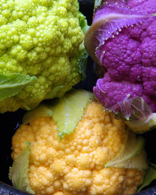 The Multi-Colour Blend cauliflower seeds offers a painterly selection of surprising cauliflower colours. Orange, purple and green cauliflower heads each mature in summer to fall. Chock-full of nutrients and amusing on the plate, our blend belongs in every foodie's garden. Grow as you would regular white cauliflower, by starting indoors in trays and transplanting into rich, fertile soil using a balanced organic fertilizer at transplant time. If growth seems to slow at any point in the season, increase irrigation and top dress with more organic fertilizer. Be sure to plan a late summer garden party and serve these eccentric florets raw with a dip - the colour is less intense and fanciful when cooked.