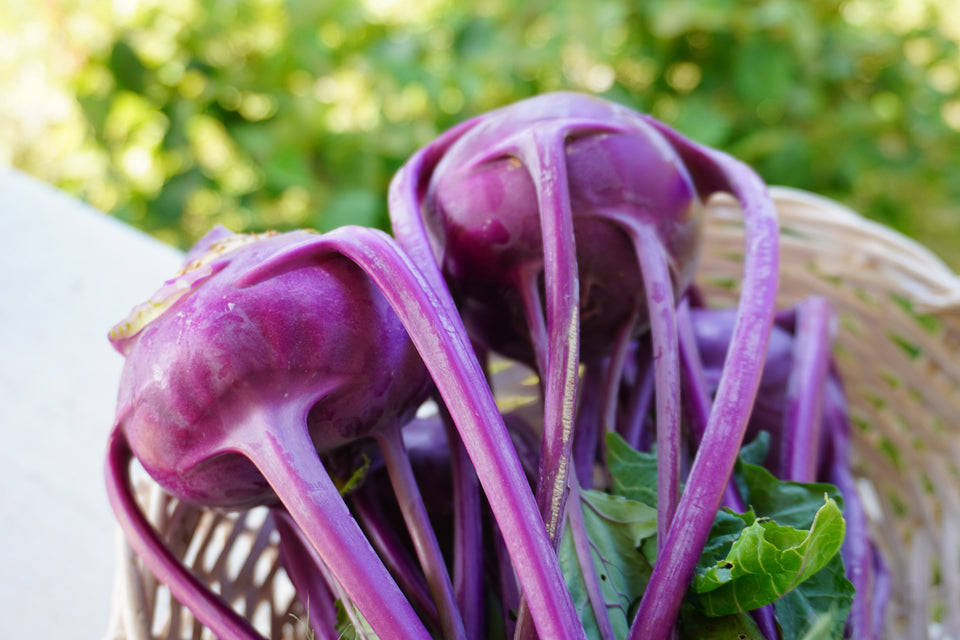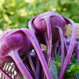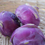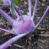 A reliable, open pollinated purple kohlrabi available as certified organic seed. Azur Star's slightly flattened globes have vibrant purple skin, upright purple stems, and a crisp white interior. Crunchy and sweet when eaten raw, try grating it for a fresh salad or slaw. Very good uniformity for an open pollinated variety.