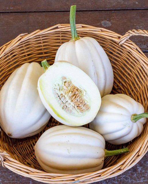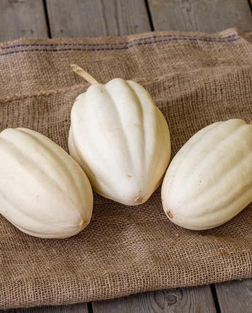 Slightly oblong acorn squashes grow on compact, semi-bush vines. The exterior skins are bright white, and hold their colour right into the fall. The interior flesh is also white and low in sugar. Read More