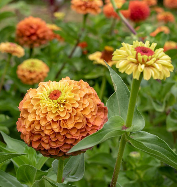 Zinnia elegans. We grew a wide range of Zinnias in the summer field trials, but this one really stood out. Queeny Lime Orange Zinnias have branching stems that grow to about 90cm (36") tall. Atop each stem is a flower of immense beauty that starts out lime green, but as its petals unfold they turn to deep peach and then orange. This colour range looks wonderful in bouquets. As cut flowers they are long lasting and luxuriant, and in the garden they are abuzz with bumble bees. The plants respond well to cutting, with more flowers forming all the time. The bloom period is from mid-summer right into September.