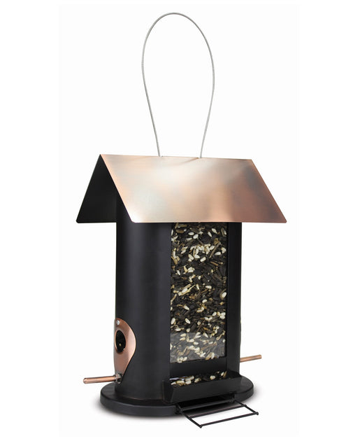Modern-design with copper polished accents impresses in any outdoor setting. High-capacity, 4-sided feeding and cardinal-friendly perch. Sturdy metal construction with liftable roof for easy filling. Designed to attract a wide variety of backyard birds, including grosbeaks, finches, chickadees, cardinals, and many other backyard birds.