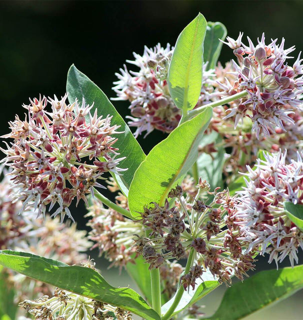 Asclepias speciosa. Native to western and central North America (including BC's Okanagan region), Showy Milkweed is the plant at the center of Monarch butterfly conservation efforts. This is the particular species of milkweed that the Monarch caterpillars feed on after hatching, so it is highly prized by egg-laying adults. The flowers are notoriously generous with nectar, so they attract a host of other butterfly species, as well as bees, hummingbirds, and many other pollinators. The plants grow to around 90cm (36") tall, with greyish green foliage topped by spherical clusters of pink flowers. Once the seed pods form, they can be cut and dried to good effect. Plant Showy Milkweed seeds anywhere to help with pollinator conservation.