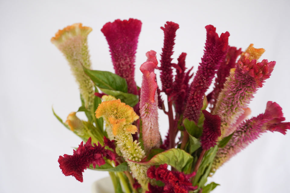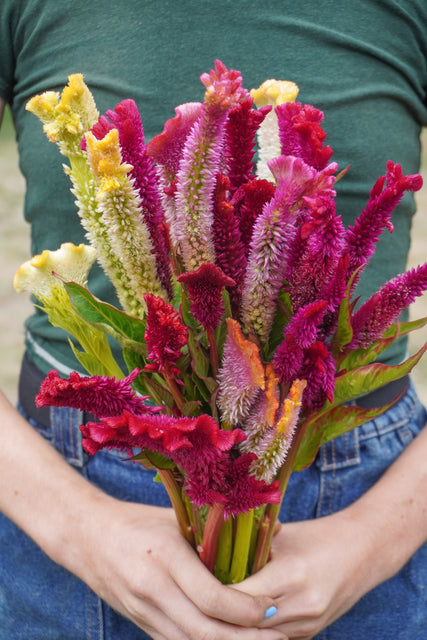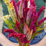 One of the earliest to mature cockscomb type celosia. Supercrest Mix blooms in shades of orange, pink, red, yellow, and green, and continues to produce fan-shaped flowers on strong stems all summer. 90-120cm (36-48”) height. Each flower has a distinctive shape resulting in a truly unique collection of blooms. Can be used for fresh and dried arrangements.