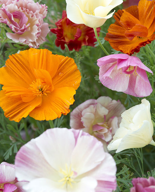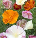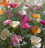 Eschscholzia californica. The Thai Silk Formula is a special blend of California Poppies featuring semi-double flowers with fluted petals and a very agreeable silken appearance. The petite plants only grow to 20cm (8") tall, with their delicate looking flowers contrasting nicely against muted, grey-green foliage. The flowers themselves can be as wide as 8cm (3"), and they work well in patio containers, rock gardens, and flower beds. California poppies are drought resistant, so they are suitable for xeriscaping, and they're also deer resistant. These poppies are known to be toxic to deer, horses, cats, and dogs.